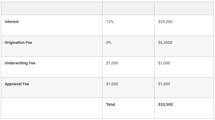 You want to purchase a fix-and-flip property that costs $300,000. To conserve capital for remodeling and renovations, you decide to take out a hard money loan to gain quick access to finance to fund the project. You approach a lender with a $90,000 down payment and ask for the remaining $210,000 over 1 year. The fee structure* could look something like this:As per this example, you would need to pay the $8,300 in fees upfront and 12 monthly interest payments of $2,100 over the 1-year term of the loan. The remaining $210,000 principal balloon payment would be due at the end of the loan contract. *This is a basic example. Additional fees and rates may differ from lender to lender.